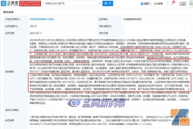 据企查查显示,近期,多家店铺出售奶茶杯等隐形变异电子烟被查处,如广西来宾一文具店,在该经营场所内查获奶茶杯电子烟浓感香芋口味、奶茶杯电子烟多肉葡萄口味、奶茶杯电子烟清醒柠檬口味等,合计6个品种共12个一次性电子烟,电子烟尚未销售成功,即被查获,无违法所得;广西柳州一文具店购进奶茶杯电子烟数量200个,销售给某小学学生且明知购烟对象为学生,案发时上述电子烟已售完,市监局对当事人罚款3万元。(信网记者)